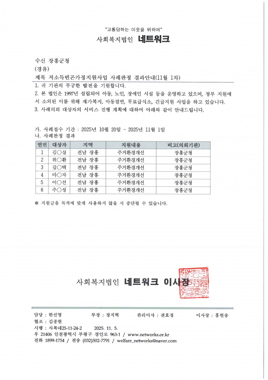저소득 빈곤가정 지원사업 25년 11월1차(접수기간: 25. 10. 20. ~ 25. 11. 1) 사례판정 결과 안내드립니다.