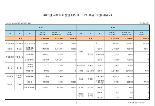 2020년도 법인사무국 1차 추경예산(안) 페이지 정보 작성자 관리자 댓글 0건 조회 6,341회 작성일 20-02-25 16:52 목록 본문 2020년도 법인사무국 1차 추경예산(안) 이전글2020년도 법인사무국 2차 추경예산(안) 20.09.17 다음글2019년도 법인사무국 결산보고 공고 20.02.25