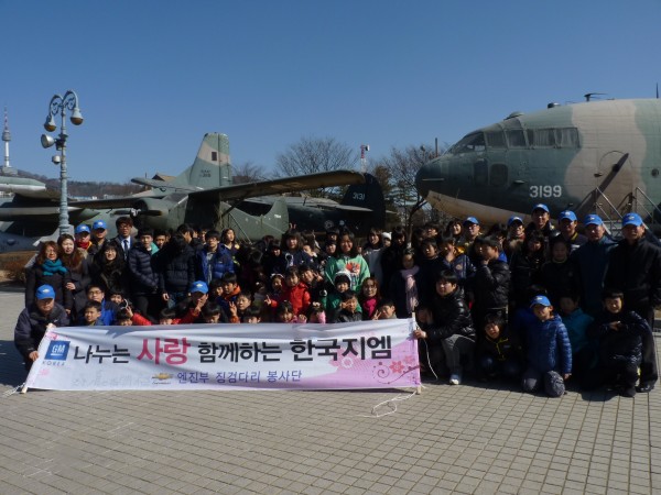 한국지엠 선생님들과 해피홈 가족들이 단체사진 찍었어요