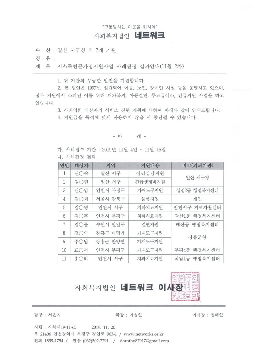 안내 저소득 빈곤가정 지원사업 19년 11월 2차(접수기간: 11. 4 ~ 11. 15) 사례판정 결과안내 페이지 정보 작성자 관리자 댓글 0건 조회 12,044회 작성일 19-11-20 16:12 목록 본문 이전글2019년 연말정산 기부금영수증 발급안내 19.11.20 다음글저소득 빈곤가정 지원사업 19년 11월 1차(접수기간: 10. 21 ~ 11. 1) 사례판정 결과안내 19.11.08