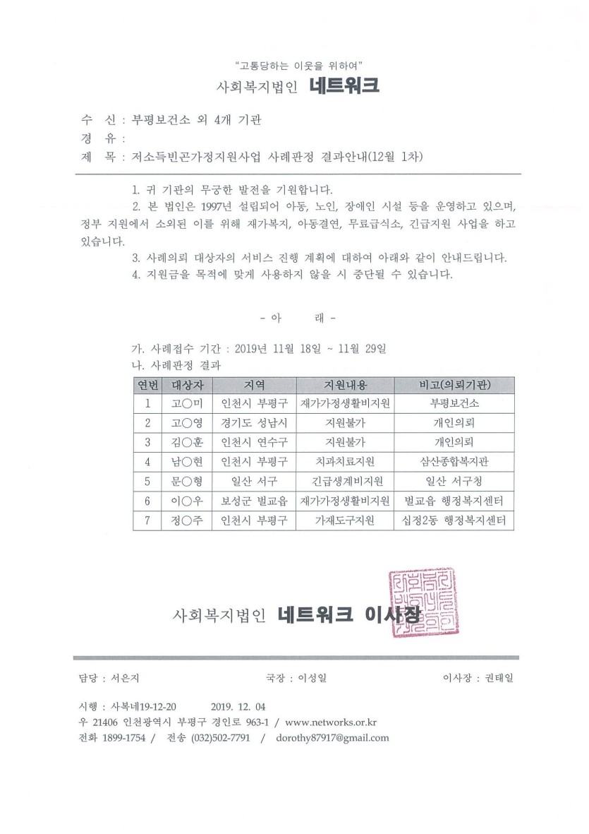 안내 저소득 빈곤가정 지원사업 19년 12월 1차(접수기간: 11. 18 ~ 11. 29) 사례판정 결과안내 페이지 정보 작성자 관리자 댓글 0건 조회 11,934회 작성일 19-12-04 18:18 목록 본문 이전글저소득 빈곤가정 지원사업 19년 12월 2차(접수기간: 12. 2 ~ 12. 13) 사례판정 결과안내 19.12.18 다음글2019년 저소득가정 청소년 석식비 지원사업 정산서 제출 및 잔액반납 안내 19.12.03