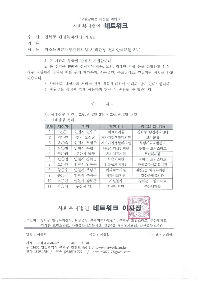 안내 저소득 빈곤가정 지원사업 20년 2월 2차(접수기간: 2. 3 ~ 2.14) 사례판정 결과안내 페이지 정보 작성자 관리자 댓글 0건 조회 11,784회 작성일 20-02-20 18:24 목록 본문 이전글<채용공고>사회복지법인 네트워크 산하시설 시설장 채용공고 20.03.02 다음글저소득 빈곤가정 지원사업 20년 2월 1차(접수기간: 1.20 ~ 1.31) 사례판정 결과안내 20.02.07