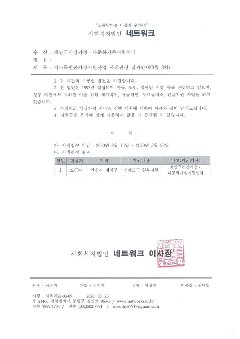 안내 저소득 빈곤가정 지원사업 20년 3월 3차(접수기간: 3. 16 ~ 3.20) 사례판정 결과안내 페이지 정보 작성자 관리자 댓글 0건 조회 11,309회 작성일 20-03-26 09:15 목록 본문 이전글2019년 사회복지법인네트워크 후원금품 사용내역 보고 20.03.31 다음글<공고>산하시설 시설장 채용 합격자 공고 20.03.20