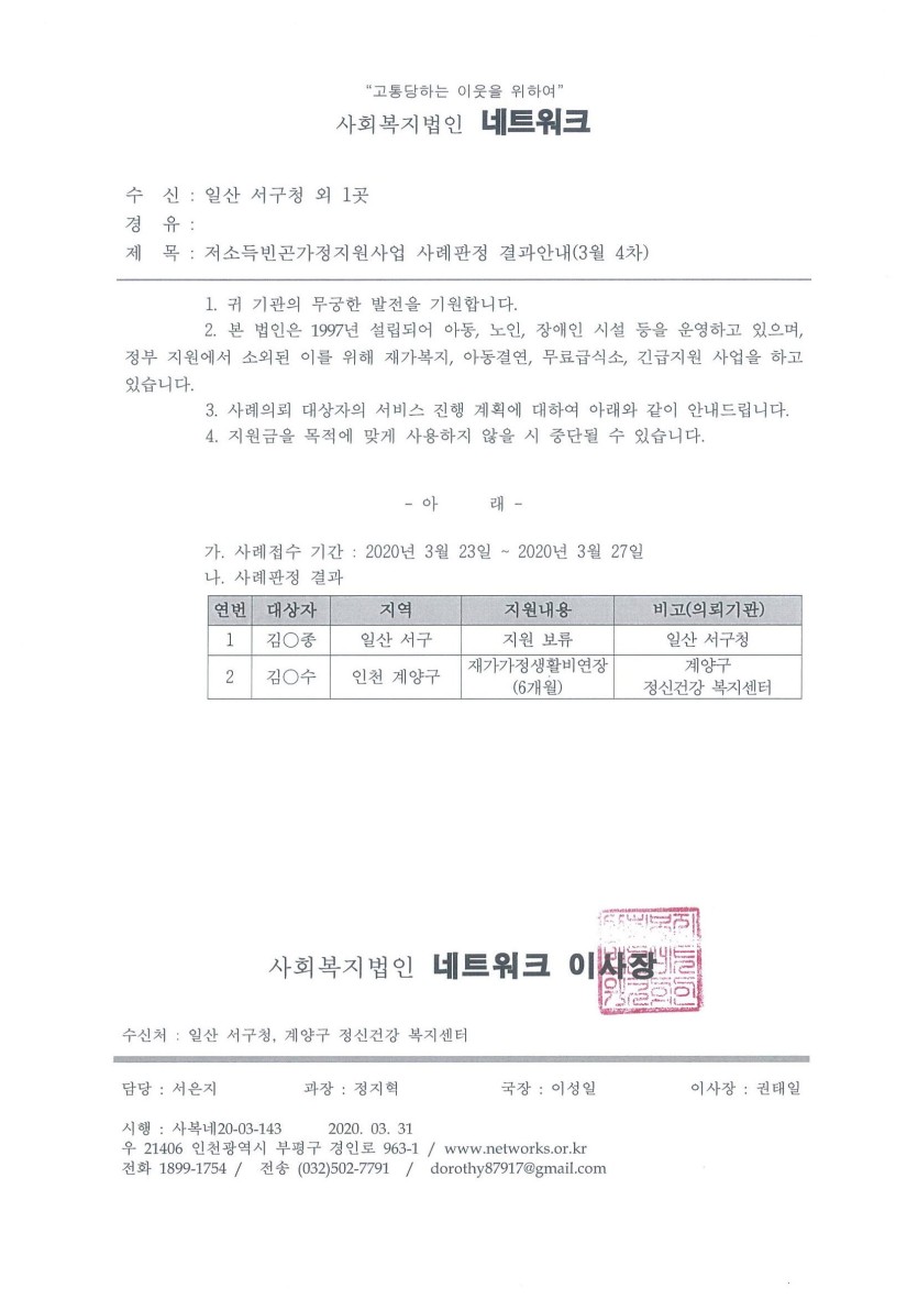 안내 저소득 빈곤가정 지원사업 20년 3월 4차(접수기간: 3.23 ~ 3.27) 사례판정 결과안내 페이지 정보 작성자 관리자 댓글 0건 조회 11,377회 작성일 20-04-01 10:19 목록 본문 이전글코로나바이러스감염증-19 예방 꼭 기억해야 할 행동수칙 20.04.14 다음글2019년 사회복지법인네트워크 후원금품 사용내역 보고 20.03.31