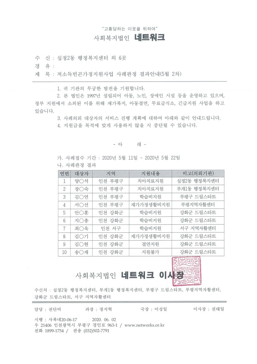 안내 저소득 빈곤가정 지원사업 20년 5월 2차(접수기간: 5. 11 ~ 5. 22) 사례판정 결과안내 페이지 정보 작성자 관리자 댓글 0건 조회 10,762회 작성일 20-06-03 14:23 목록 본문 이전글저소득 빈곤가정 지원사업 20년 6월 1차(접수기간: 5. 25 ~ 6. 5) 사례판정 결과안내 20.06.09 다음글2019년 연간 기부금 모금액 및 활용실적 명세서 20.05.19