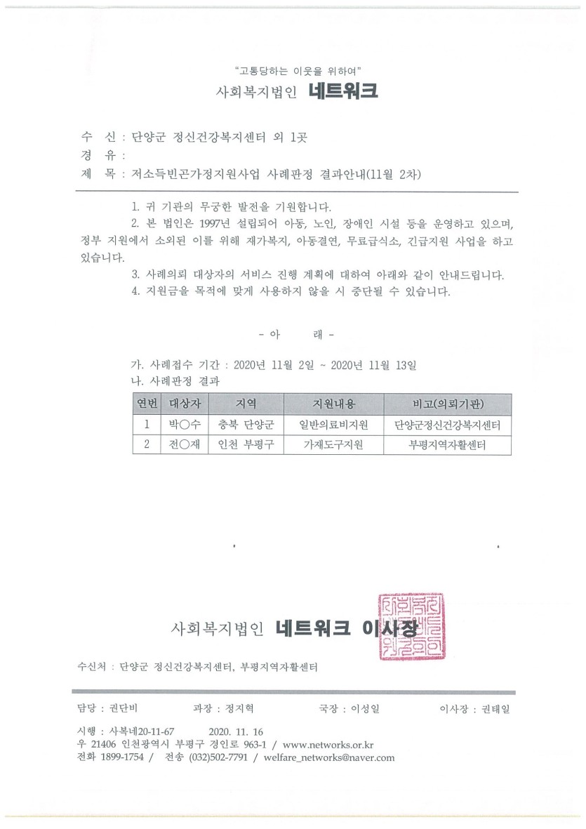 안내 저소득 빈곤가정 지원사업 20년 11월 2차(접수기간: 11. 02 ~ 11. 13) 사례판정 결과안내 페이지 정보 작성자 관리자 댓글 0건 조회 12,344회 작성일 20-11-18 13:42 목록 본문 이전글2020년 연말정산 기부금영수증 발급안내 20.12.01 다음글저소득 빈곤가정 지원사업 20년 11월 1차(접수기간: 10. 19 ~ 10. 30) 사례판정 결과안내 20.11.05
