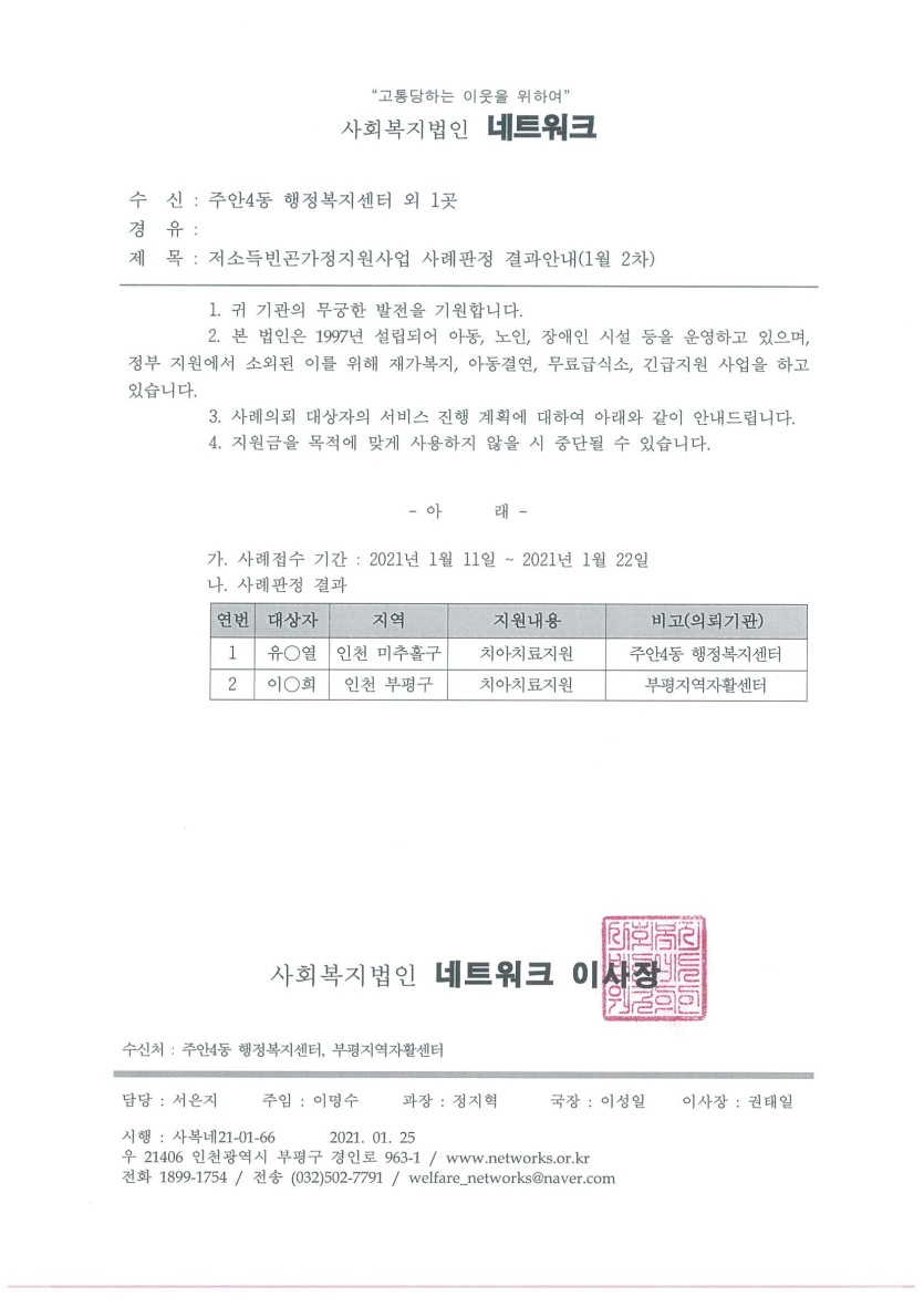 안내 저소득 빈곤가정 지원사업 21년 1월 2차(접수기간: 21. 1. 11 ~ 21. 1. 22) 사례판정 결과안내 페이지 정보 작성자 관리자 댓글 0건 조회 11,758회 작성일 21-01-29 11:21 목록 본문 이전글저소득 빈곤가정 지원사업 21년 2월 1차(접수기간: 21. 1. 25 ~ 21. 1. 29) 사례판정 결과안내 21.02.04 다음글저소득 빈곤가정 지원사업 21년 1월 1차(접수기간: 20. 12. 24 ~ 21. 1. 8) 사례판정 결과안내 21.01.19
