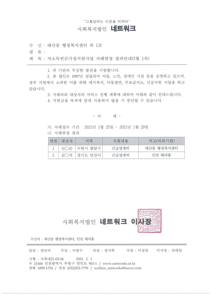 안내 저소득 빈곤가정 지원사업 21년 2월 1차(접수기간: 21. 1. 25 ~ 21. 1. 29) 사례판정 결과안내