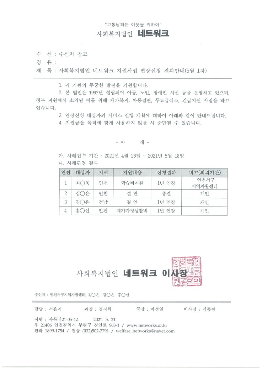 안내 사회복지법인 네트워크 지원사업 연장신청 결과안내(5월 1차) 페이지 정보 작성자 관리자 댓글 0건 조회 11,648회 작성일 21-05-27 17:21 목록 본문 사회복지법인 네트워크 5월 1차 연장신청결과 안내드립니다. 이전글저소득 빈곤가정 지원사업 21년 6월 1차(접수기간: 21. 5. 17 ~ 21. 6. 18) 사례판정 결과안내 21.06.24 다음글저소득 빈곤가정 지원사업 21년 5월 1차(접수기간: 21. 4. 19 ~ 21. 5. 14) 사례판정 결과안내 21.05.27
