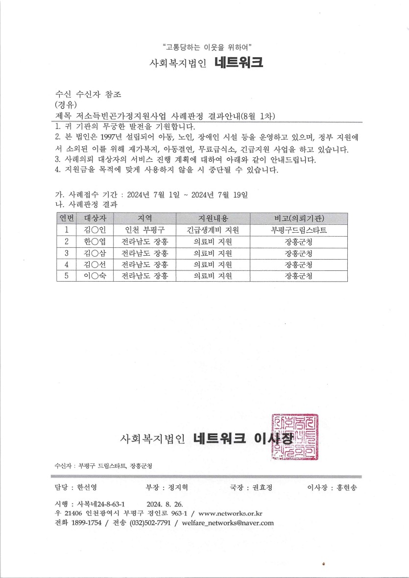 저소득 빈곤가정 지원사업 24년 8월 1차 사례판정 결과안내드립니다.
