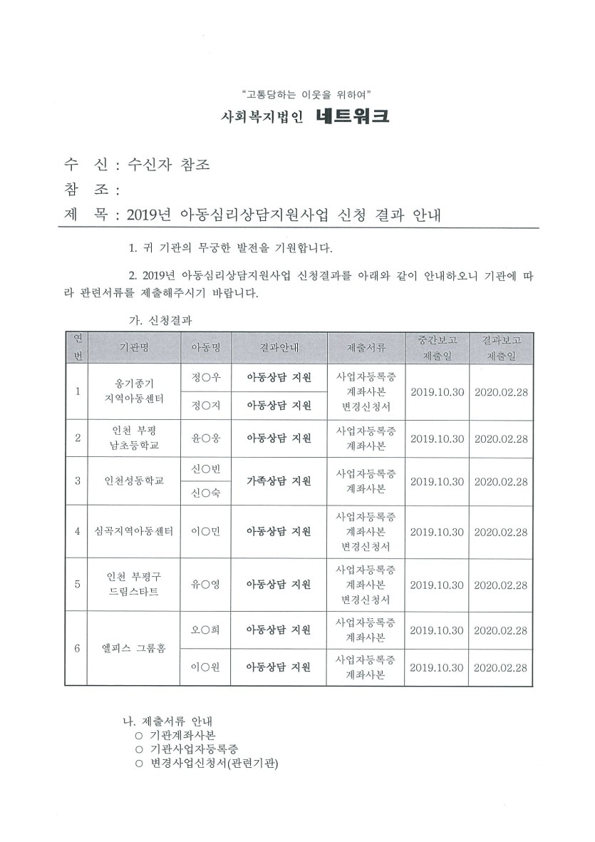 안내 2019년 아동심리상담지원사업 신청 결과 안내