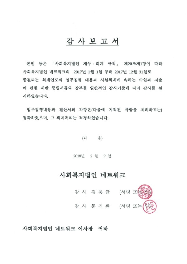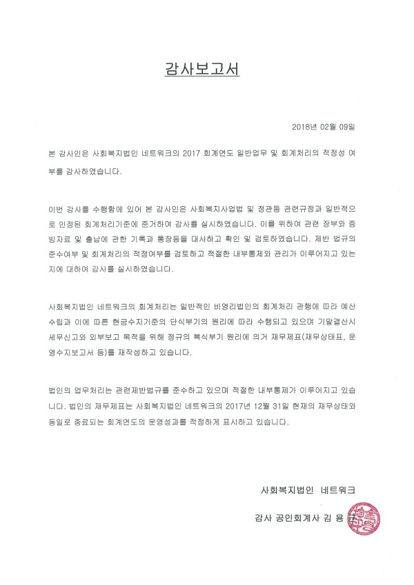 2017년 사회복지법인 네트워크 감사보고서 공고