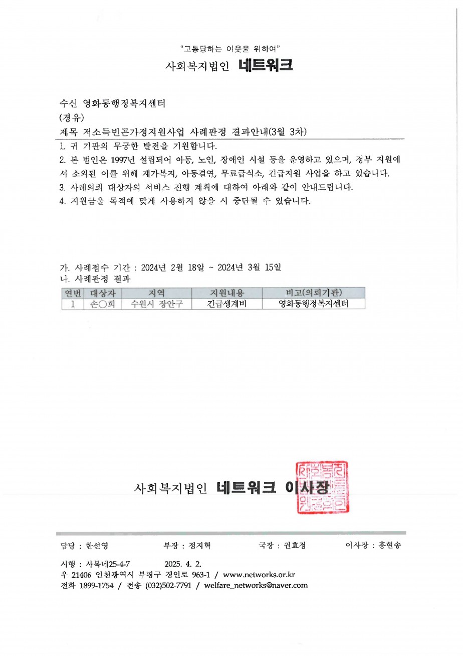 저소득 빈곤가정 지원사업 25년 3월3차(접수기간: 25. 2. 18. ~ 25. 3. 15) 사례판정 결과안내드립니다.