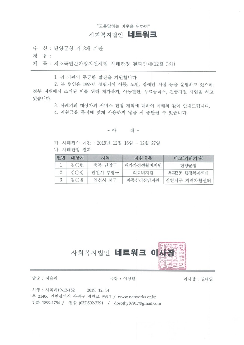 안내 저소득 빈곤가정 지원사업 19년 12월 3차(접수기간: 12. 16 ~ 12. 27) 사례판정 결과안내 페이지 정보 작성자 관리자 댓글 0건 조회 11,664회 작성일 20-01-03 17:17 목록 본문 이전글저소득 빈곤가정 지원사업 20년 1월 1차(접수기간: 19.12.30 ~ 20. 1. 3) 사례판정 결과안내 20.01.09 다음글사회복지사 채용 서류심사 결과 안내 19.12.26