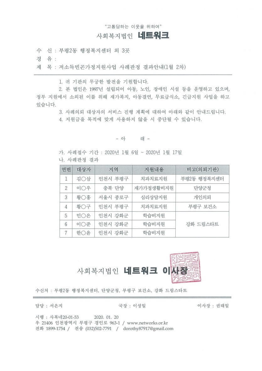 안내 저소득 빈곤가정 지원사업 20년 1월 2차(접수기간: 1. 6 ~ 1.17) 사례판정 결과안내 페이지 정보 작성자 관리자 댓글 0건 조회 11,711회 작성일 20-01-21 11:37 목록 본문 이전글저소득 빈곤가정 지원사업 20년 2월 1차(접수기간: 1.20 ~ 1.31) 사례판정 결과안내 20.02.07 다음글저소득 빈곤가정 지원사업 20년 1월 1차(접수기간: 19.12.30 ~ 20. 1. 3) 사례판정 결과안내 20.01.09
