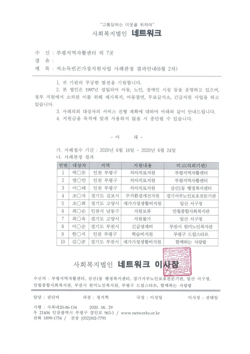안내 저소득 빈곤가정 지원사업 20년 6월 2차(접수기간: 6. 16 ~ 6. 24) 사례판정 결과안내 페이지 정보 작성자 관리자 댓글 0건 조회 10,344회 작성일 20-07-01 10:09 목록 본문 이전글저소득 빈곤가정 지원사업 20년 7월 1차(접수기간: 6. 29 ~ 7. 03) 사례판정 결과안내 20.07.08 다음글의료비지원사업 종결보고서 양식 안내 20.06.17