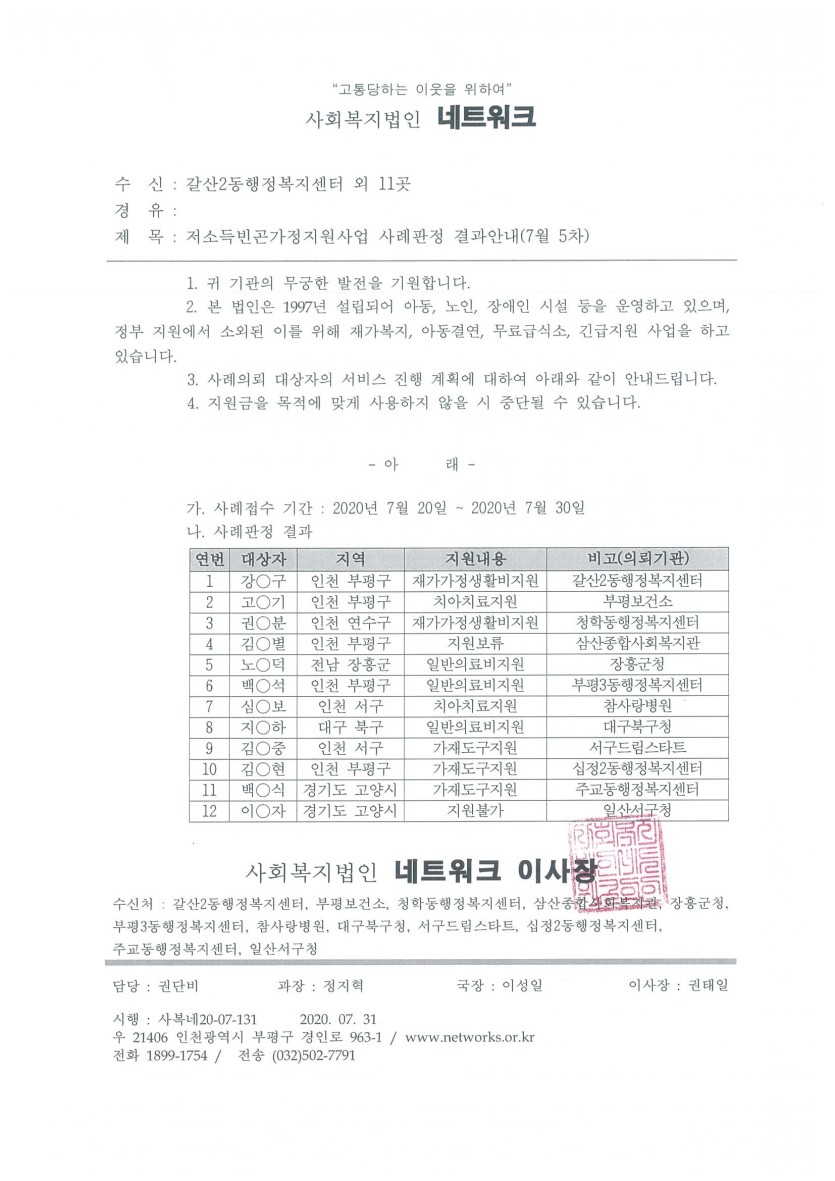 안내 저소득 빈곤가정 지원사업 20년 7월 5차(접수기간: 7. 20 ~ 7. 30) 사례판정 결과안내 페이지 정보 작성자 관리자 댓글 0건 조회 10,328회 작성일 20-08-05 16:24 목록 본문 이전글저소득 빈곤가정 지원사업 20년 8월 1차(접수기간: 7. 31 ~ 8. 21) 사례판정 결과안내 20.08.27 다음글사회복지법인 네트워크 의료비지원 의뢰결과(6월~7월 의뢰건) 안내 20.08.03