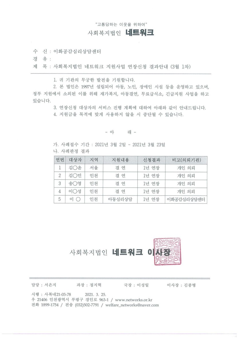 안내 사회복지법인 네트워크 지원사업 연장신청 결과안내(3월 1차)