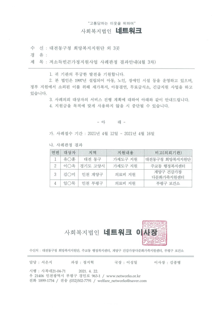 저소득 빈곤가정 지원사업 21년 4월 3차(접수기간: 21. 4. 12 ~ 21. 4. 16) 사례판정 결과안내 > 공지사항