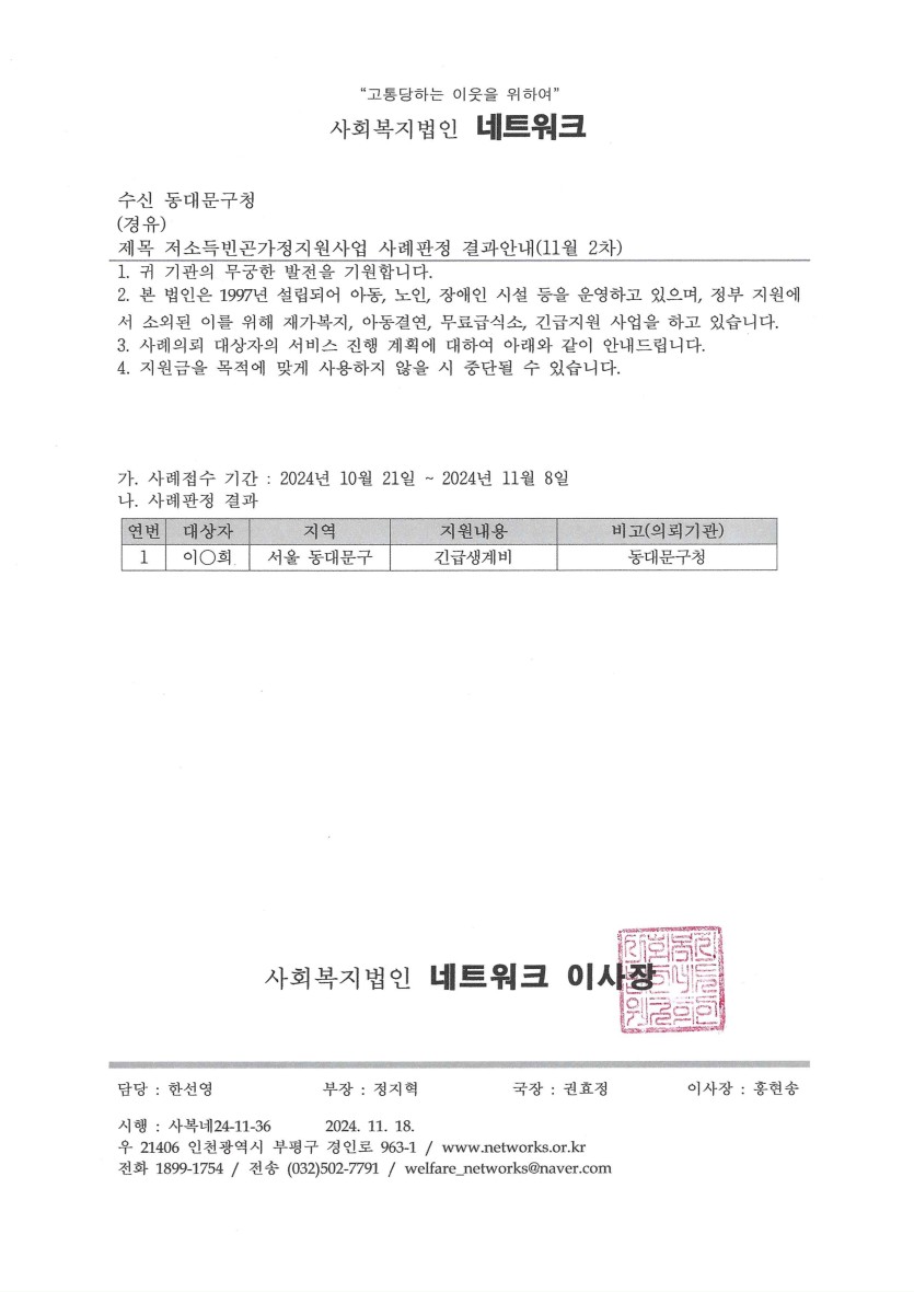 안내 저소득 빈곤가정 지원사업 24년 11월2차(접수기간: 24. 10. 21 ~ 24. 11. 8) 사례판정 결과안내