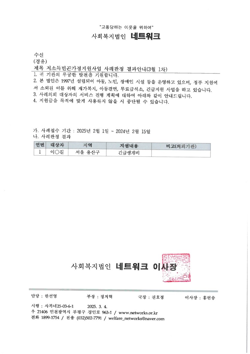 저소득 빈곤가정 지원사업 25년 3월1차(접수기간: 25. 2. 1.  ~ 24. 2. 15) 사례판정 결과안내드립니다.