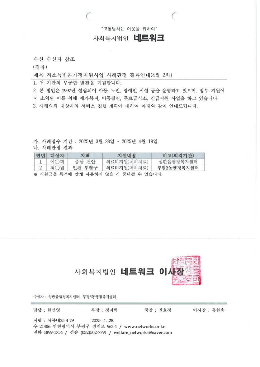 저소득 빈곤가정 지원사업 25년 4월2차(접수기간: 25. 3. 28. ~ 25. 4. 18) 사례판정 결과안내 > 공지사항