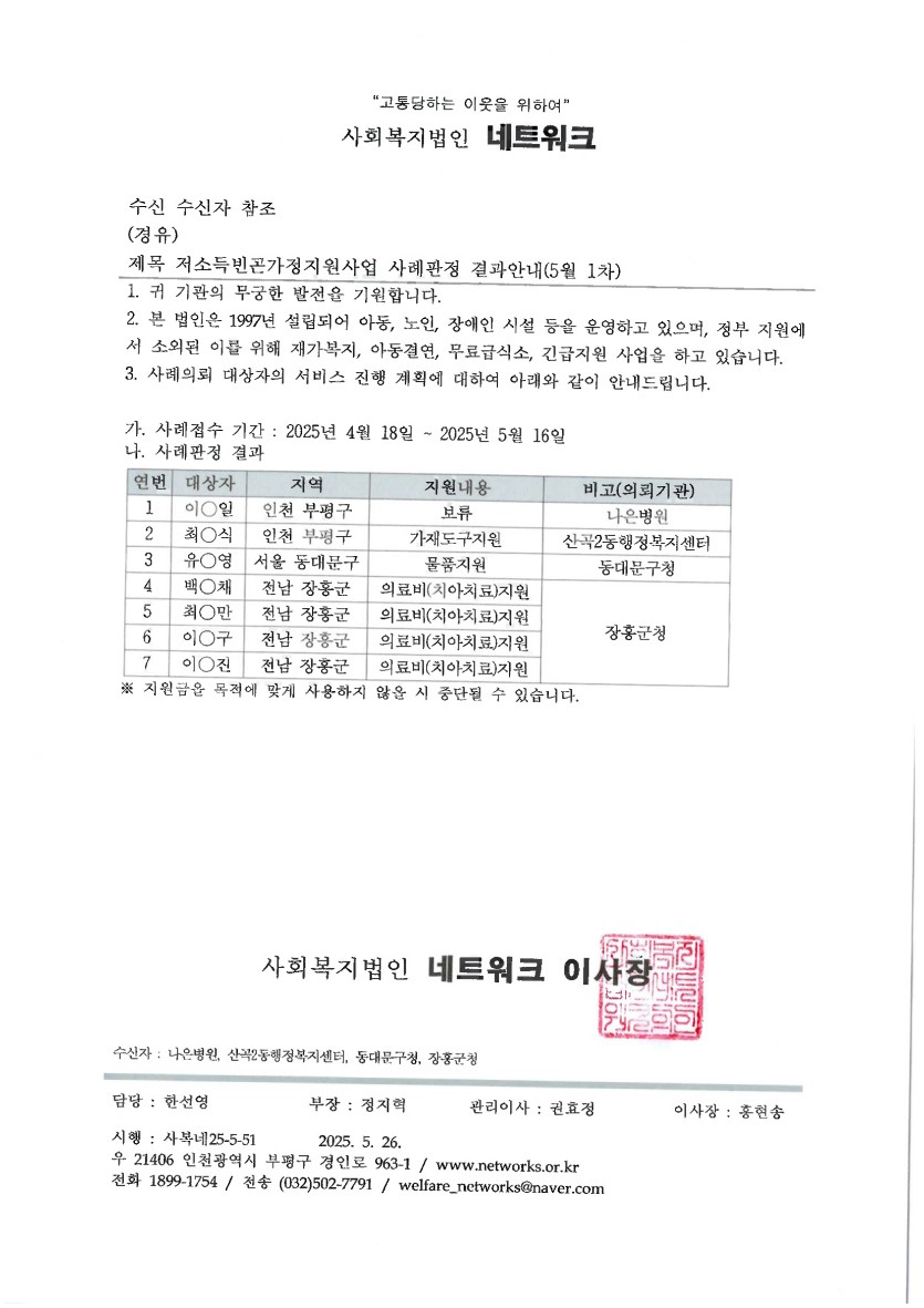 저소득 빈곤가정 지원사업 25년 5월1차(접수기간: 25. 4. 18. ~ 25. 5. 16) 사례판정 결과안내드립니다.