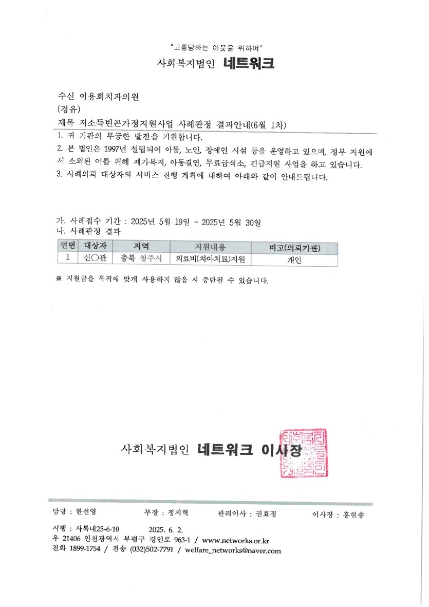 안내 저소득 빈곤가정 지원사업 25년 6월1차(접수기간: 25. 5. 19. ~ 25. 5. 30) 사례판정 결과 안내