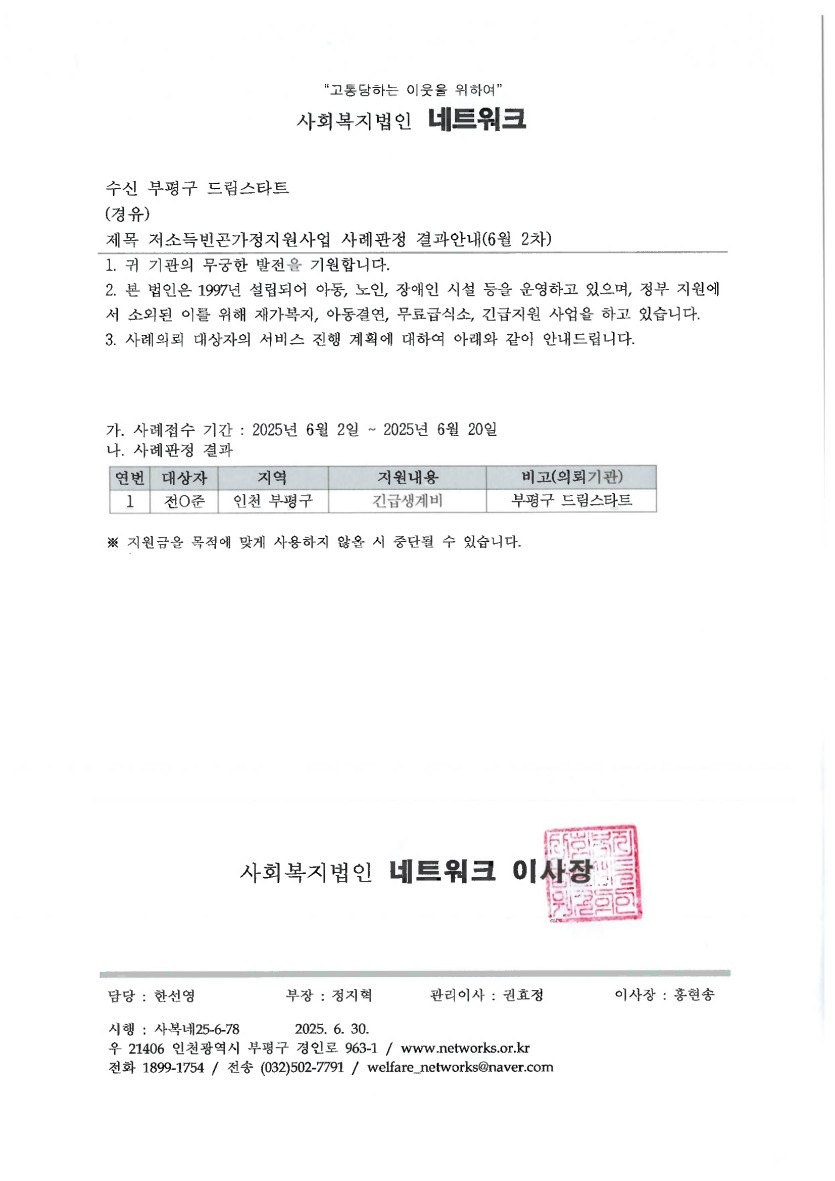 저소득 빈곤가정 지원사업 25년 6월2차(접수기간: 25. 6. 2. ~ 25. 6. 20) 사례판정 결과 안내드립니다.