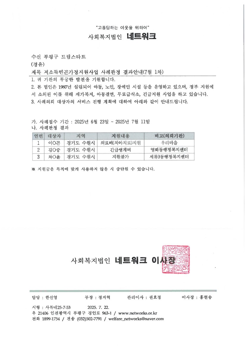 안내 저소득 빈곤가정 지원사업 25년 7월1차(접수기간: 25. 6. 23. ~ 25. 7. 11) 사례판정 결과 안내