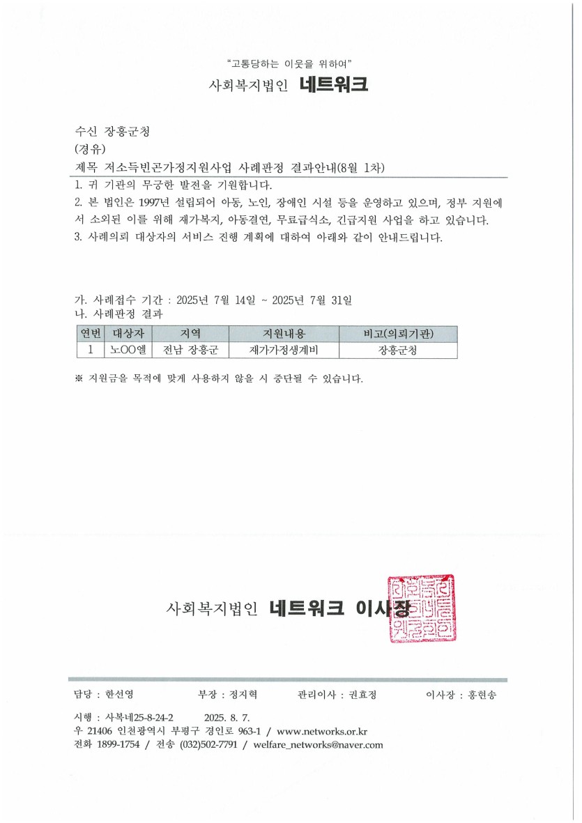 저소득 빈곤가정 지원사업 25년 8월1차(접수기간: 25. 7. 14. ~ 25. 7. 31) 사례판정 결과 안내 > 공지사항