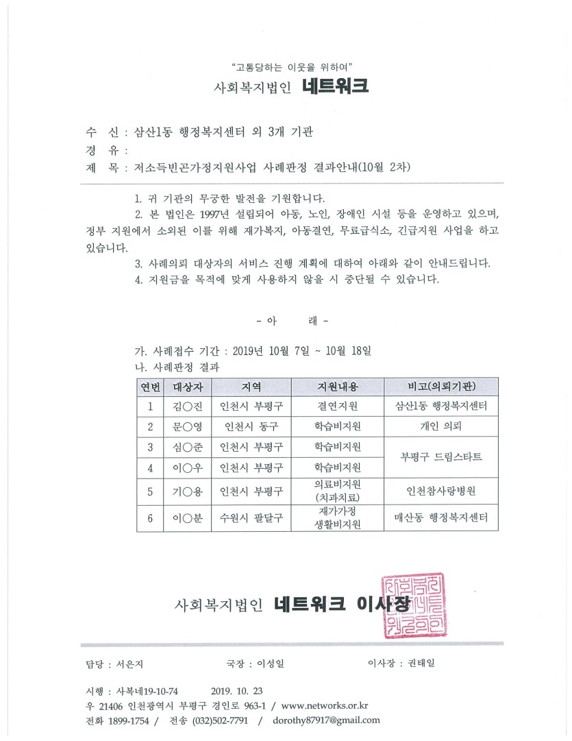안내 저소득 빈곤가정 지원사업 19년 10월 2차(접수기간: 10. 7 ~ 10. 18) 사례판정 결과안내 페이지 정보 작성자 관리자 댓글 0건 조회 12,063회 작성일 19-10-23 11:00 목록 본문 이전글2019년 사회복지법인네트워크 경로식당 식자재 납품업체 1차 서류평가 선정결과 공고 19.10.24 다음글저소득 빈곤가정 지원사업 19년 10월 1차(접수기간: 9. 23 ~ 10. 4) 사례판정 결과안내 19.10.22